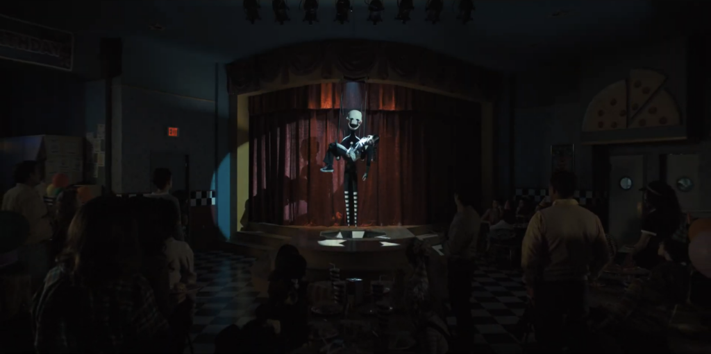 The film opens with a flashback sequence at the original Freddy Fazbear’s Pizza restaurant. A girl named Charlotte Emily (Audrey Lynn Marie) is pulled by her best friend Vanessa Afton (child: Miriam Spumpkin, adult: Elizabeth Lail) to go have a piece of cake instead of sitting by the stage alone. While sitting there, Charlotte sees a boy being lured into the back rooms by William Afton (Matthew Lillard), the founder of the restaurant, in a yellow rabbit costume. Charlotte panics, attempting to alert any nearby parents of the situation, but she is ignored. As she decides to take matters into her own hands, Vanessa tries to stop her, but Charlotte enters the back rooms anyway. While she manages to rescue the boy by carrying him out of the backrooms, she collapses soon afterwards—having been stabbed by William three times in the back. She falls through the trapdoor onstage and is caught by the Marionette animatronic, which rises with a now deceased Charlotte in its arms. William is never caught and the restaurant closes down soon afterwards as a result.